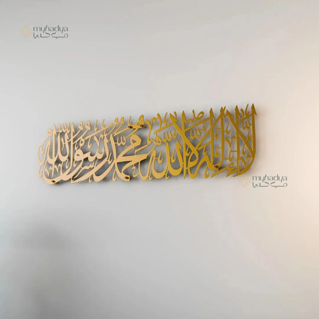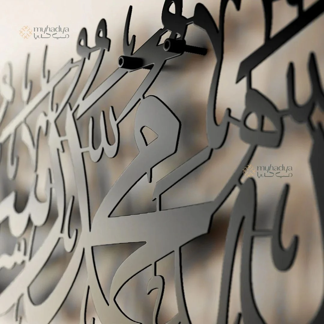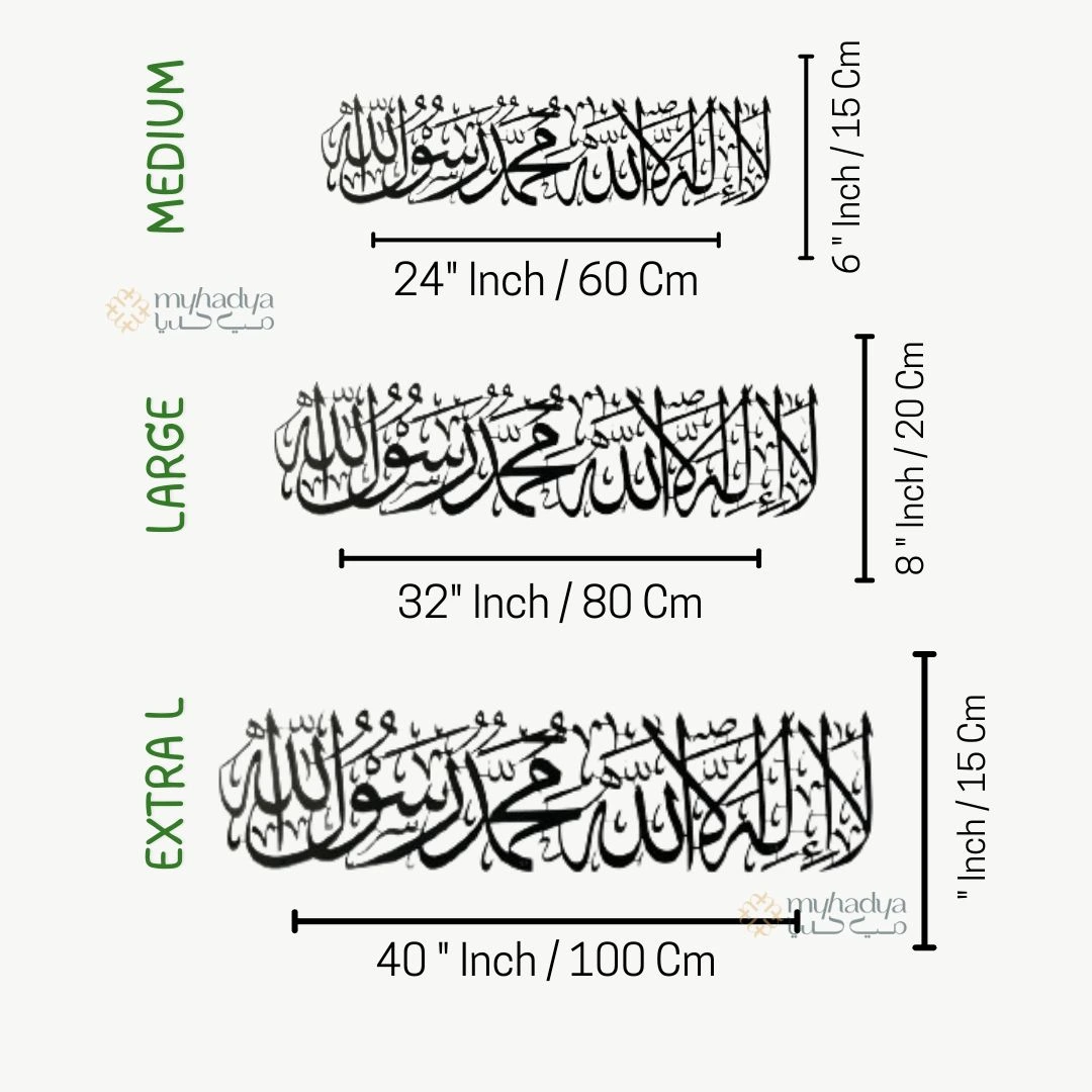 Elevate your space with this beautifully crafted wall decor piece featuring the First Kalima (“Lā ilāha illāllāh, Muḥammadur Rasūlullāh”) in elegant metal. Made from 2 mm thick mild steel (MS), this art offers durability, depth, and a subtle 3D effect that catches light and attention from every angle.